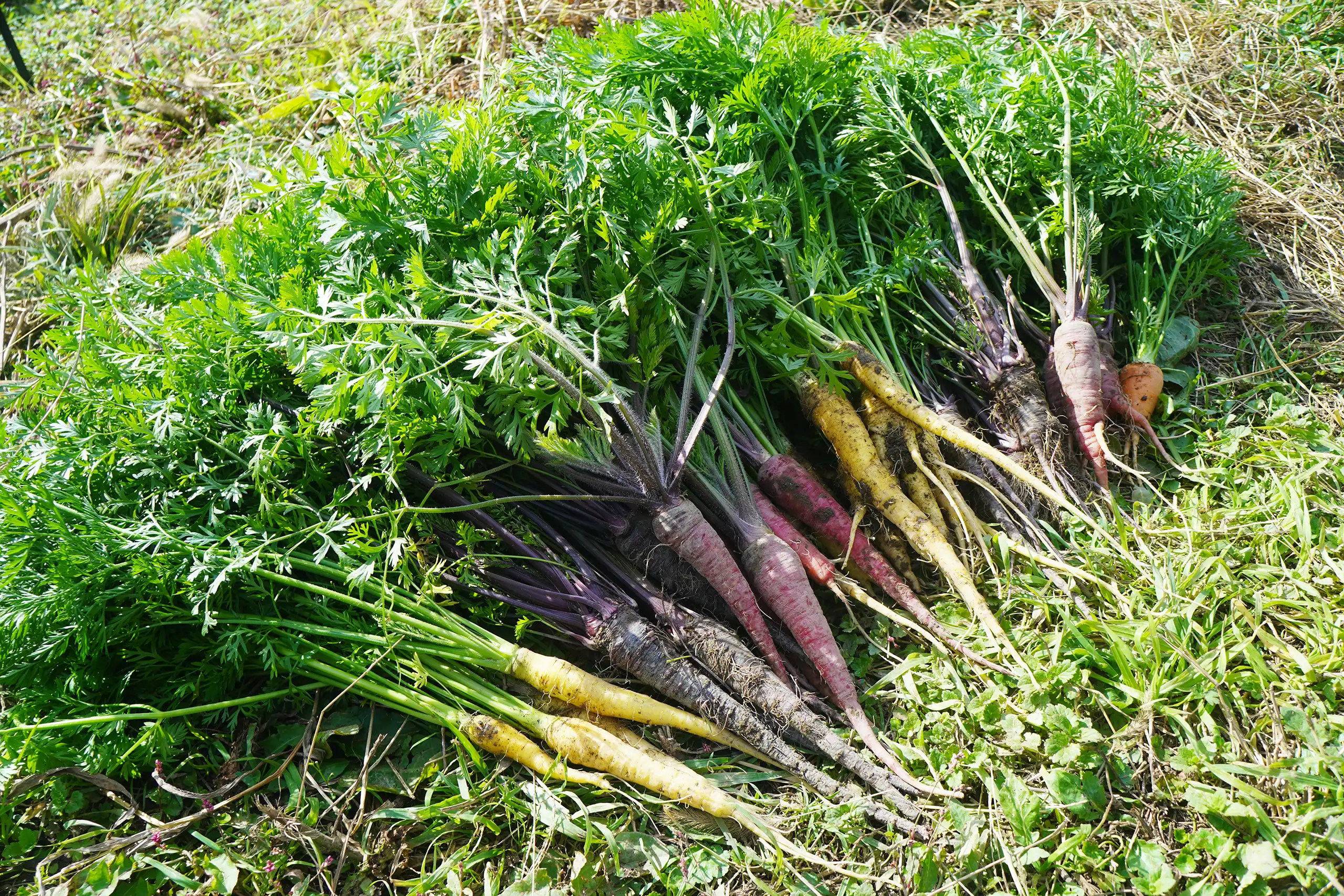 「収獲した葉付人参。葉っぱも人参の味がして、とっても美味しいです。」