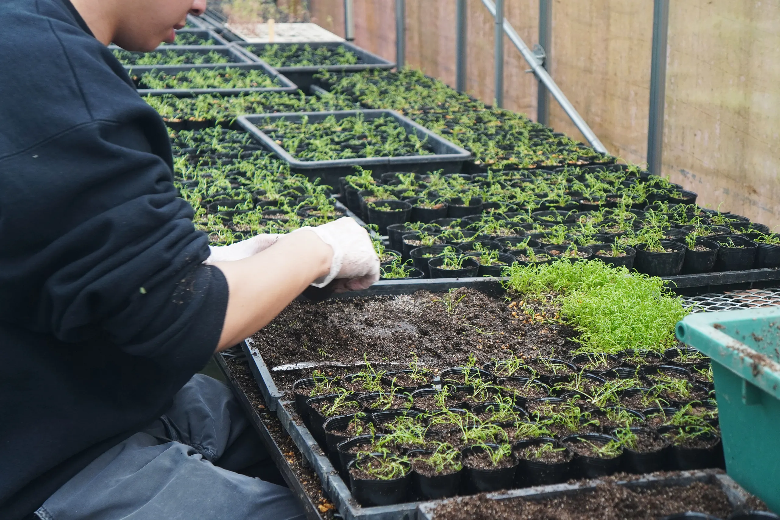 「カモミールの鉢上げ作業。約700鉢になりました。初夏の開花が楽しみです。」