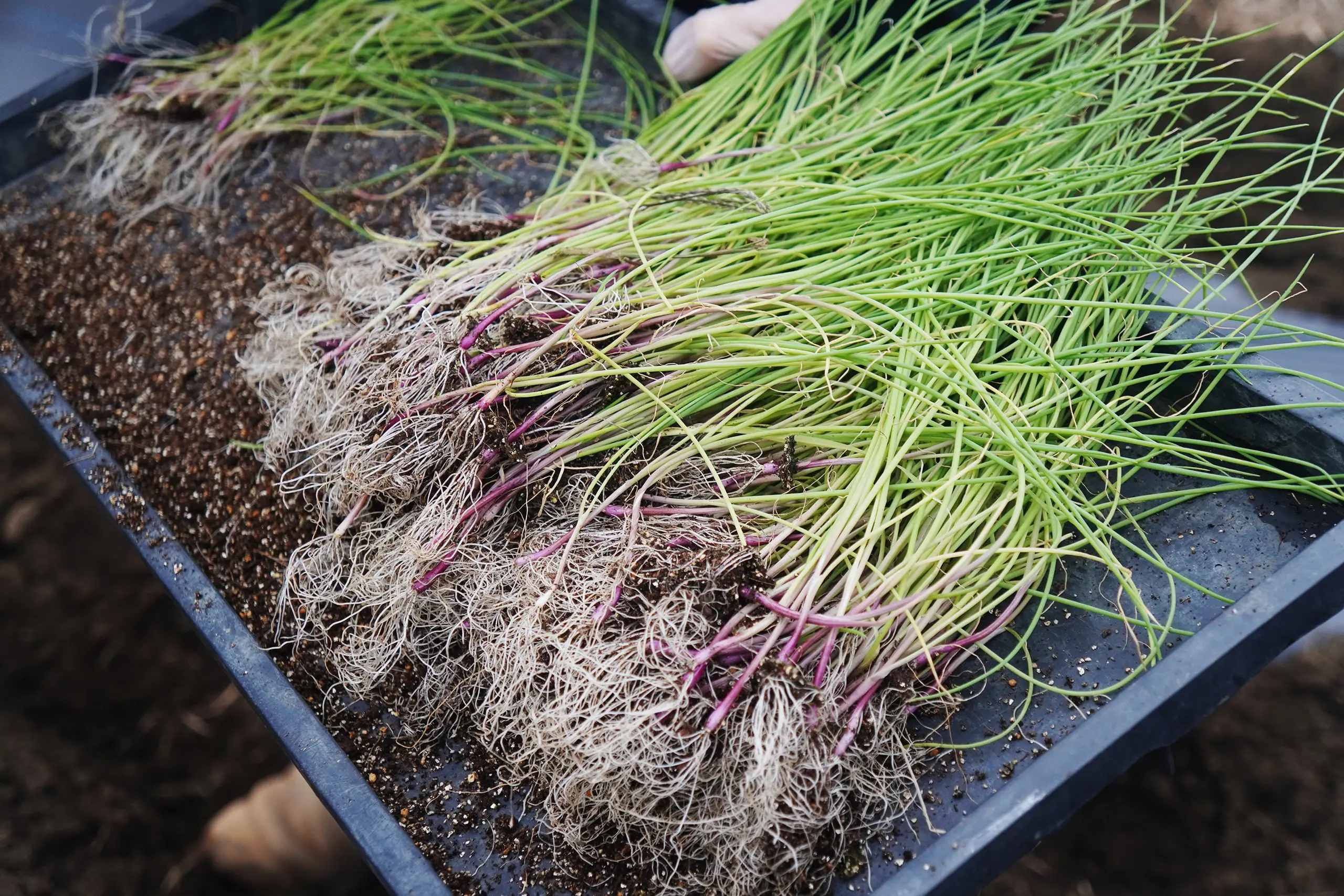 レモングラスは株上げして室内へ、カモミールは来春の開花に向けて畑への定植するために鉢上げを行っています。