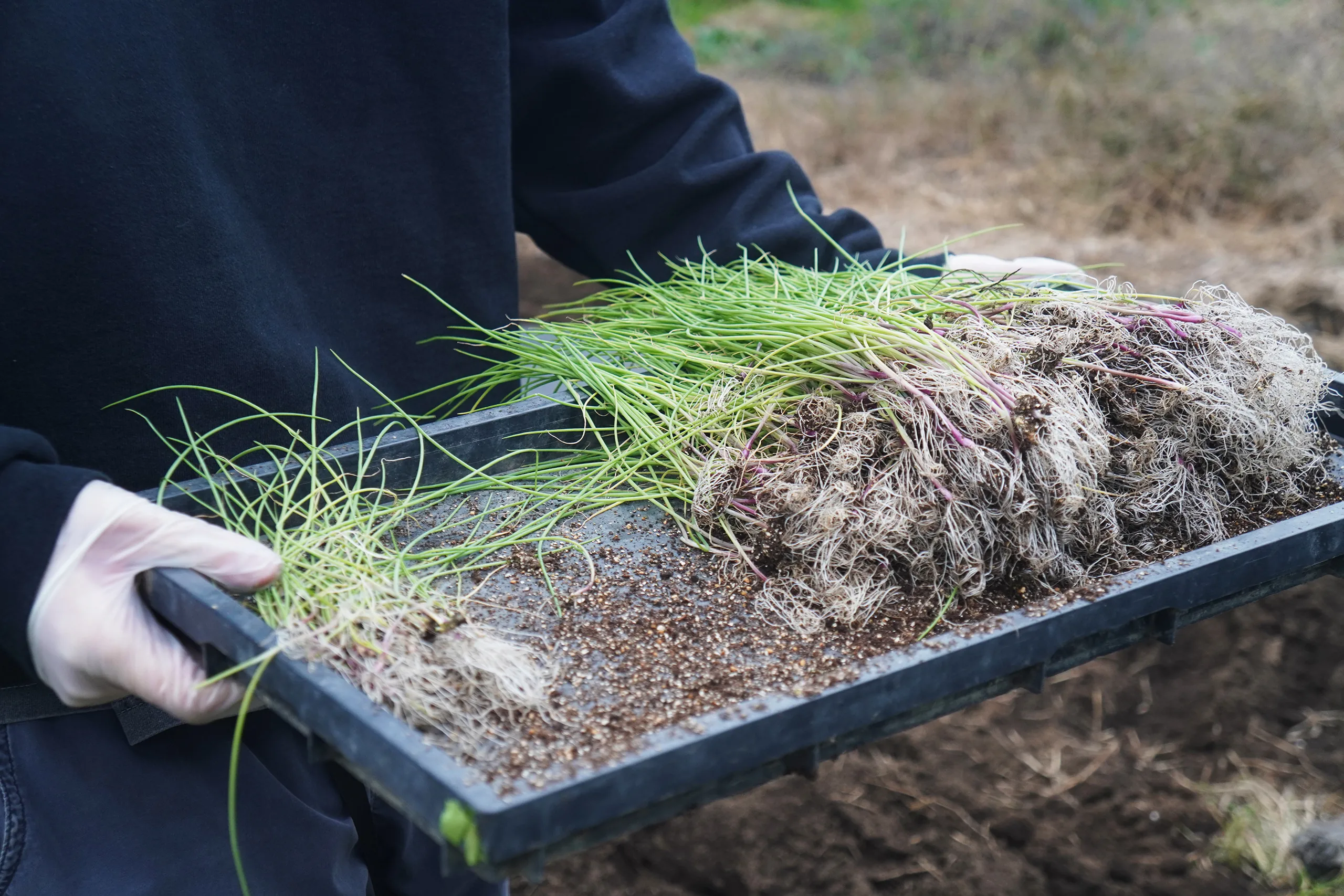 「秋の彼岸の頃に種まきした赤玉ねぎの苗を定植します。初夏に収穫する赤玉ねぎは秋に植えます。」