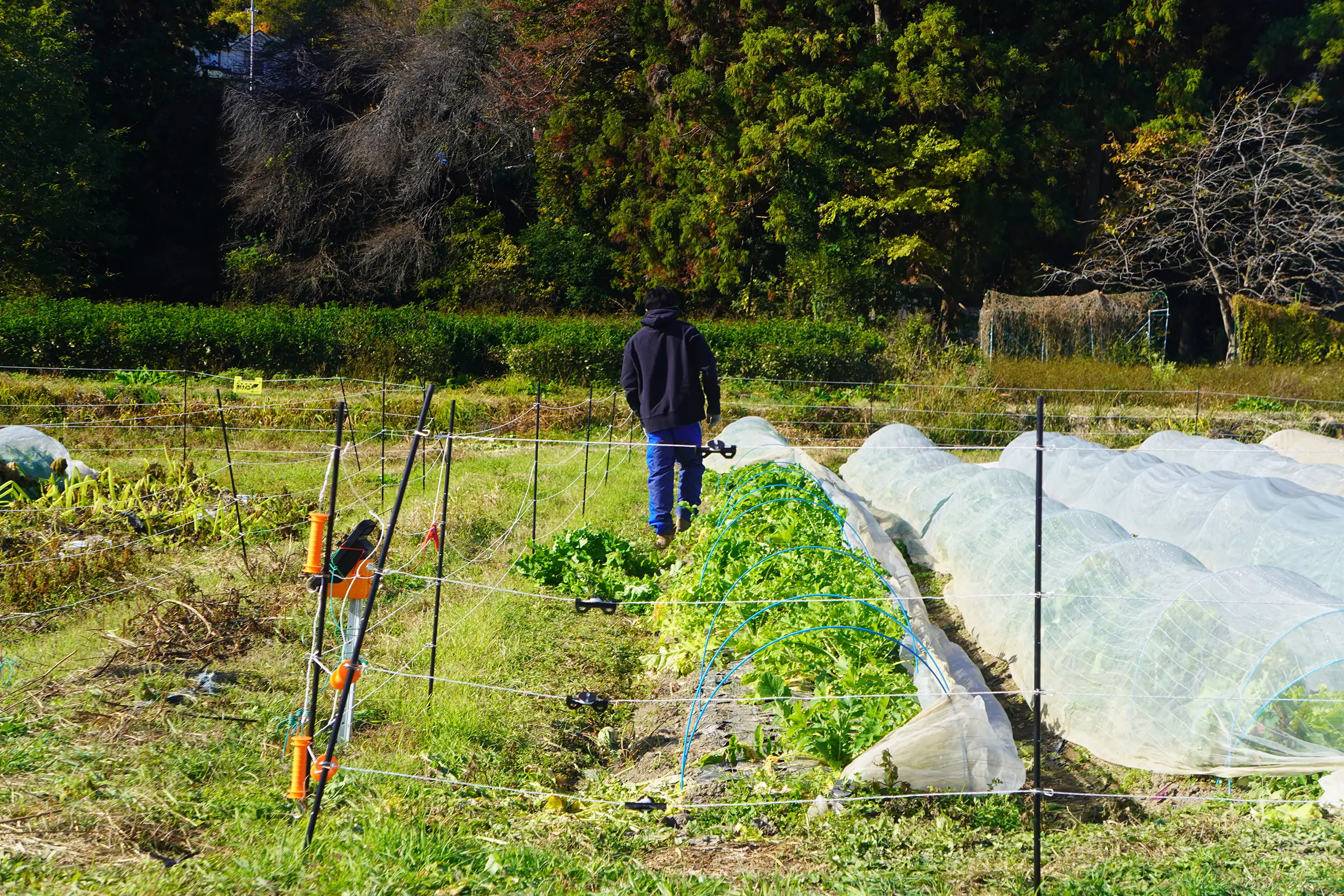 「山に囲まれているので、鹿やイノシシが出没するので、電気柵を設置して侵入を防ぎます。」